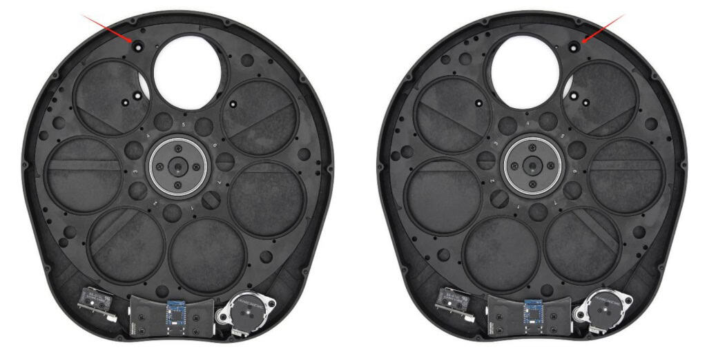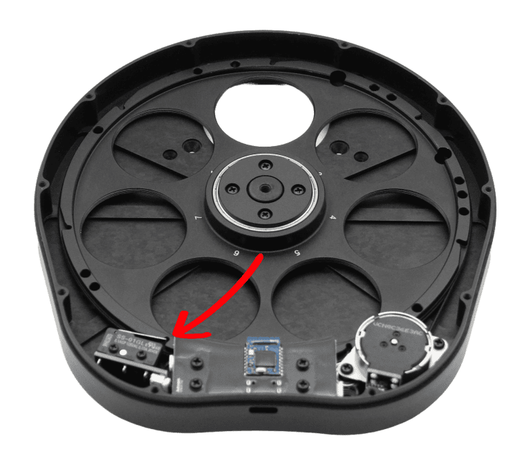Here’s how it works: when you select a new filter, the unidirectional wheel rotates clockwise until the desired position is reached. Then, it reverses until the mechanical switch hits a physical stop (see image below). Once engaged, the wheel is locked firmly into place. This innovative locking mechanism guarantees your filter wheel returns to the exact same physical position night after night, filter change after filter change. It’s a feature you won’t find anywhere else—and one that delivers unmatched reliability and consistency for your astrophotography workflow.